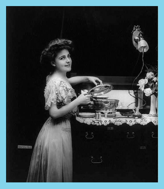 Cooking has always been fraught with danger. This innocent young woman has an electric serving dish apparently plugged into a lamp.